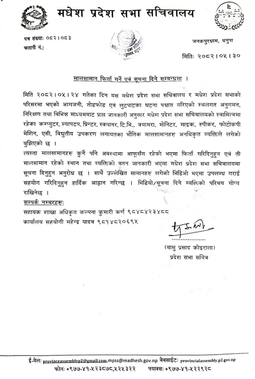 मिति २०८२।६।२८ गते दिनको १ बजे मधेश प्रदेश सभाको बैठक बस्ने व्यहोरा जानकारीको लागि अनुरोध छ ।